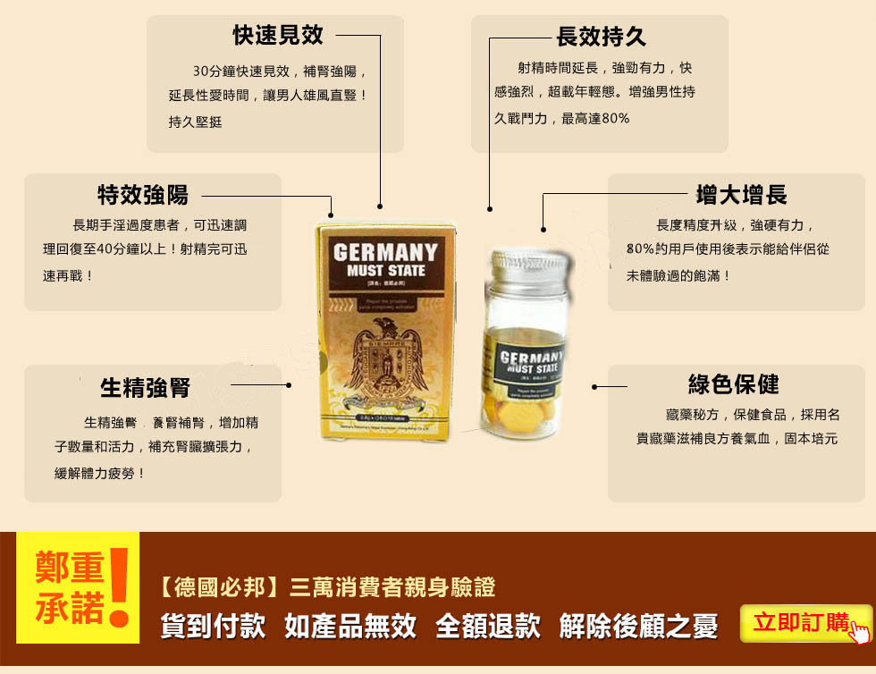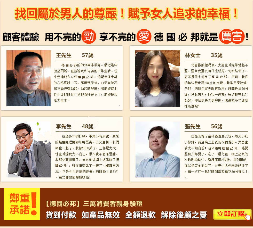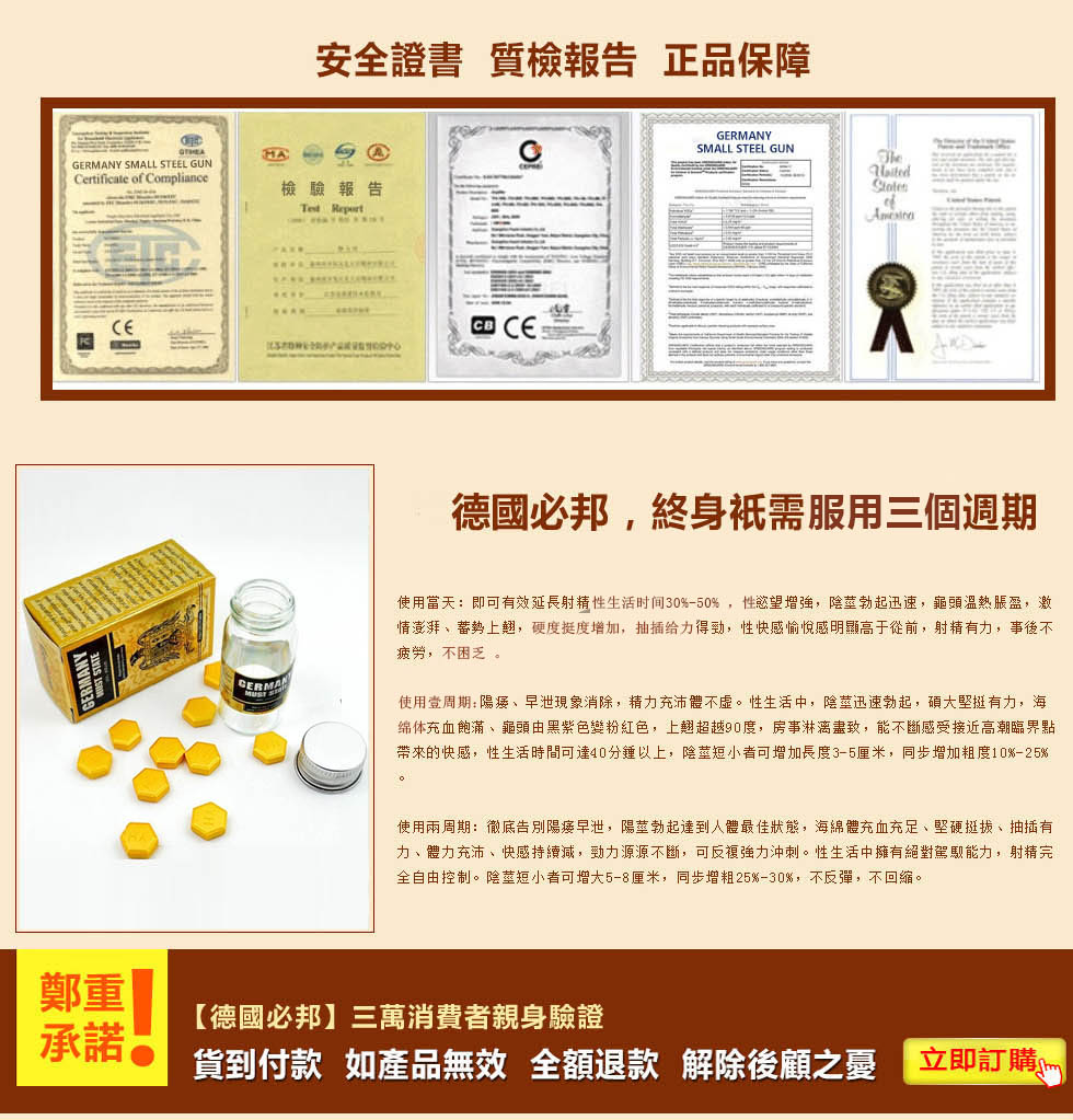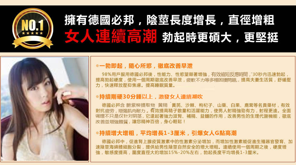 德國必邦于2013在美國上市販售,一上市就獲得超強超好效果的高度評價!經過多年年的市場開拓與臨床試驗,德國必邦中「靶向活性肽」針對男性陽痿 不舉症狀、早洩不持久、陰莖短小的男性有特效,故在2016在台灣地區成立進入大樹藥局販售,請認準本網『https://gredttref.com.tw』是台灣唯一正品販賣中心!